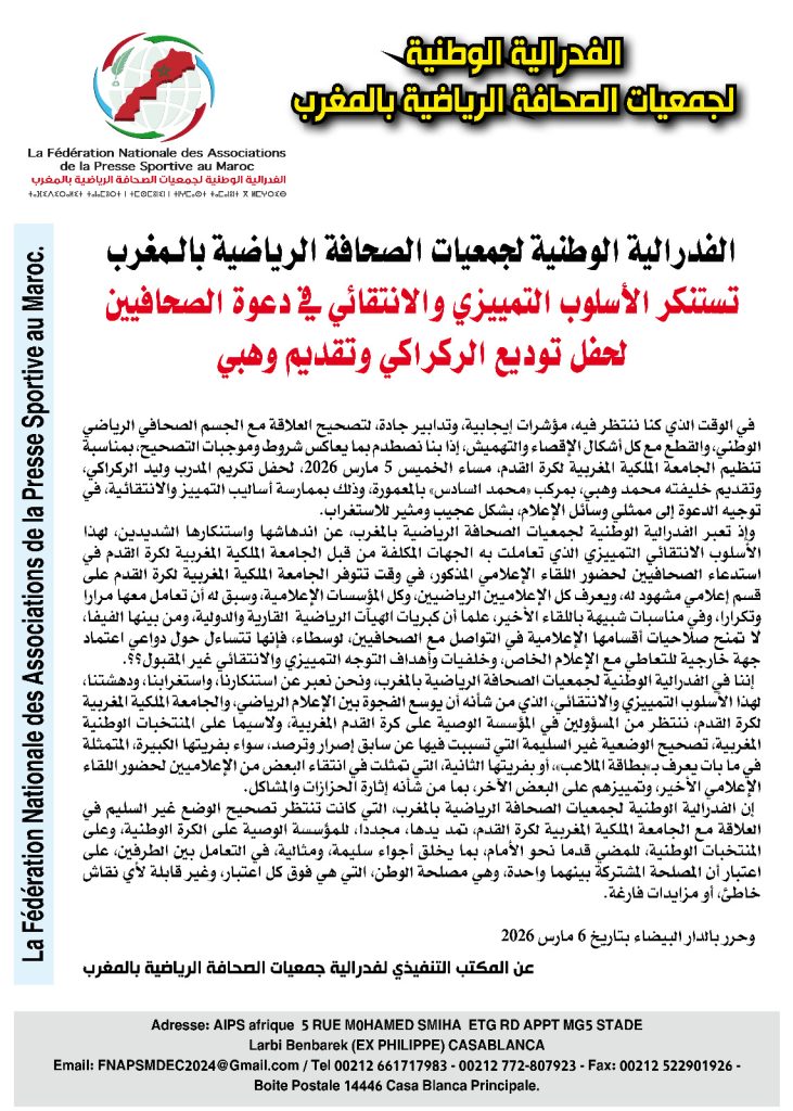 الفدرالية الوطنية لجمعيات الصحافة الرياضية بالمغرب تستنكر الأسلوب التمييزي والانتقائي في دعوة الصحافيين لحفل توديع الركراكي وتقديم وهبي