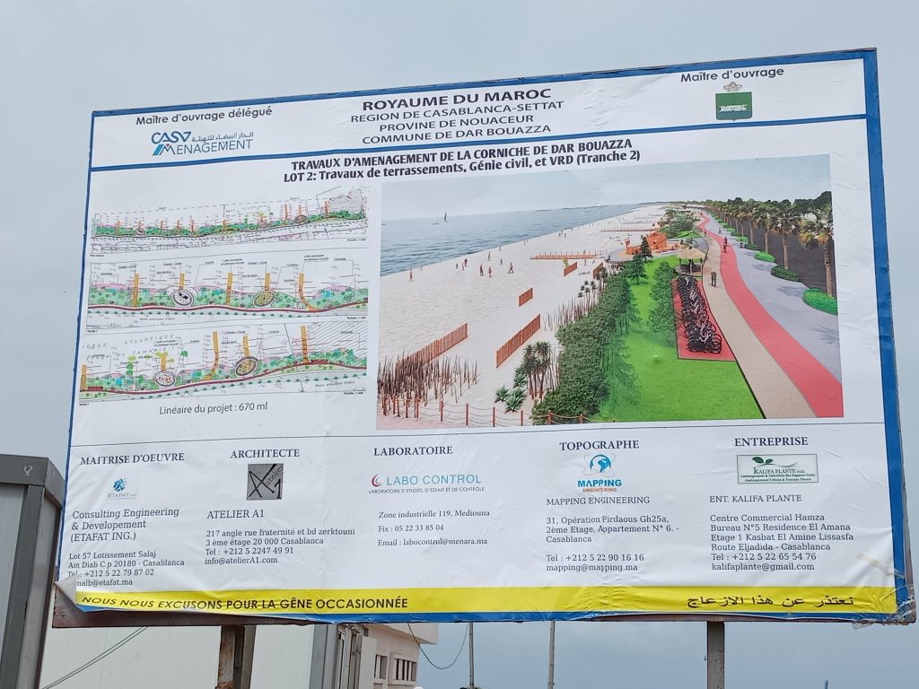 وشملت هذه الجولة مشروع تهيئة كورنيش دار بوعزة – الشطر الثاني، الذي يُعد من المشاريع الهيكلية الهادفة إلى تثمين الواجهة الساحلية للمنطقة وتعزيز جاذبيتها السياحية والترفيهية. ويروم هذا المشروع إحداث فضاءات عصرية مهيأة للتنزه والاستجمام، إلى جانب تجهيز مرافق وخدمات تستجيب لحاجيات الزوار وساكنة المنطقة، بما يسهم في الرفع من القيمة الجمالية والسياحية للشريط الساحلي.